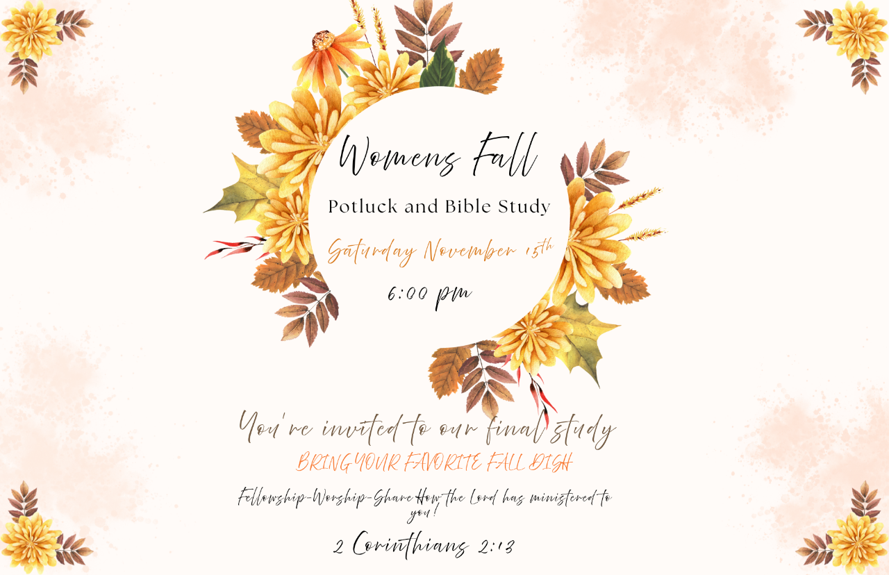 Ladies join us for our final Women’s Fall bible study & Potluck! We will be completing our study in the book of 2 Corinthians . Join us Saturday Night November 15th at 6pm for a time of food, fellowship, worship, snd the Word. Nursing infants are welcome. No childcare provided.
